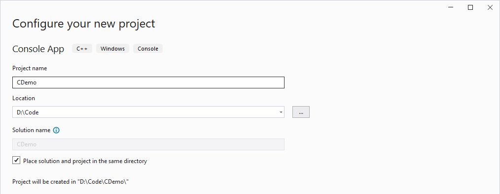 - Give the project any name and location that you like. I called mine “CDemo”, but it doesn’t matter. Click Create when ready.