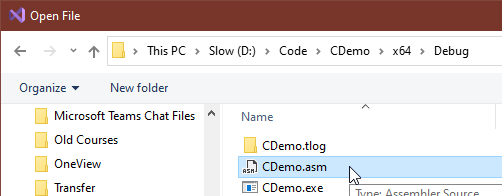 - Visual Studio’s “Open File” dialog will take you to the root of your solution. Navigate to the x64 sub-folder and then the Debug folder. If you do not have an x64 folder, then you should have an x86 folder. If you do not have that either, then step 8 failed or you didn’t wait for it to finish or you have changed your Visual Studio settings in a way that I can’t predict. Inside your Debug folder, or whatever oddball place you sent your output to, locate the file with the name of your solution and an asm extension and double-click it. DON’T PANIC.